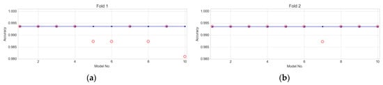 To evaluate the effect of the number of models in the ensemble, we created different ensembles with the number of models ranging from one to ten and evaluated the performance of each ensemble on the test set. We also evaluated the performance of each of the ten standalone models on the test set. Figure 11 shows the accuracies of the accumulative ensemble models indicated by the blue stars and curve as well as the accuracies of the unique standalone models indicated by the red circles. When there is one model, the results of the ensemble model and the single model are always identical, and as the size of the model increases, the advantages of the ensemble are clearly revealed. The traditional ensemble method, such as random forests [44,45], typically consists of 30 decision trees, and in many cases the number of decision trees is over 100. However, the number of models in a CNN ensemble is normally from 5 to 10 because more models make it more time consuming and computationally expensive to train. As shown in Figure 11, when there are five or more models, the blue curves of the ensembles showed accuracies that are better or comparable to those of single models in almost all cases. Fold 1, fold 2, and fold 5 had the same characteristics. The use of an ensemble helps to achieve high accuracies and keep accuracies stabilized better than randomly selected single models whose accuracies are sometimes high and sometimes a little lower. In fold 3, increasing the model number of the ensemble does not only increase accuracy, but it also maintains a stable state. In the case of fold 4, when the number of models in the ensemble increased, the accuracy also is increased; however, many single models with lower accuracies added make the accuracy of the ensemble models a little lower. Nonetheless, the ensemble accuracy is still higher than almost any randomly selected single models.