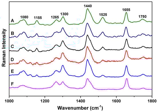 Figure 1 presents the Raman scattering spectra of the six olive oil samples of A, B, C, D, E, and F with 532 nm green laser excitation. All these samples show characteristic vibrational modes at 1080 cm−1, 1265 cm−1, 1300 cm−1, 1440 cm−1, 1655 cm−1, and 1750 cm−1. The mode at 1080 cm−1 can be assigned to (C–C) stretching of the (CH2)n group; the mode at 1265 cm−1 can be assigned to (=C–H) deformation of cis (R–HC=CH–R); the mode at 1300 cm−1 can be assigned to (C–H) bending twist of the CH2 group; the mode at 1440 cm−1 can be assigned to (C–H) scissoring of CH2; the mode at 1655 cm−1 can be assigned to (C=C) of cis (RHC=CHR); the mode at 1750 cm−1 can be assigned to (C=O) stretching of RC=OOR [24,25,26,27]. These are the common characteristic vibrational modes of almost all edible vegetable oils.