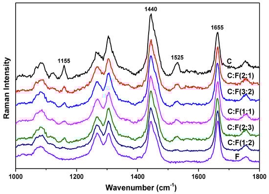 Raman spectra of the mixtures of sample C and F with volume ratios of 2:1, 3:2, 1:1, 2:3, and 1:2. For comparison, the spectra of sample C and F are included in the figure. The intensities of all the spectra are normalized using the intensity of the vibrational mode at 1655 cm−1 as a reference. Each spectrum is y-shifted for clarity.