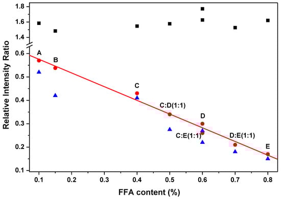 Figure 3 presents the relative intensity ratios of I1525/I1655 and I1155/I1655 as a function of FFA content in extra virgin olive oil samples; for comparison, the relative intensity ratio of I1440/I1655 is also presented in the figure. Seven different FFA contents from 0.1% to 0.8% are included in Figure 3. Samples A, B, C, D, and E had FFA content of 0.1%, 0.15%, 0.4%, 0.6%, and 0.8%, respectively. Mixtures of C and D, and D and E with volume ratio 1:1 were prepared to obtain FFA content of 0.5% and 0.7%, respectively. Also, a mixture of C and E with volume ratio 1:1 was prepared to obtain FFA content of 0.6%, for comparison with sample D. As can be seen in Figure 3, the relative intensity ratios of I1525/I1655 and I1155/I1655 decrease linearly with increasing FFA contentin extra virgin olive oils. The intensity ratio of I1525/I1655 shows a better linear correlation with FFA content in extra virgin olive oil than that of I1155/I1655. This would be due to the vibrational mode at 1525 cm−1 being less affected by its surrounding peaks than that of 1155 cm−1, consistent with the result in Table 1. Therefore, the relative intensity ratio of I1525/I1655 would be a good parameter for rapid analyses of FFA content in extra virgin olive oil.