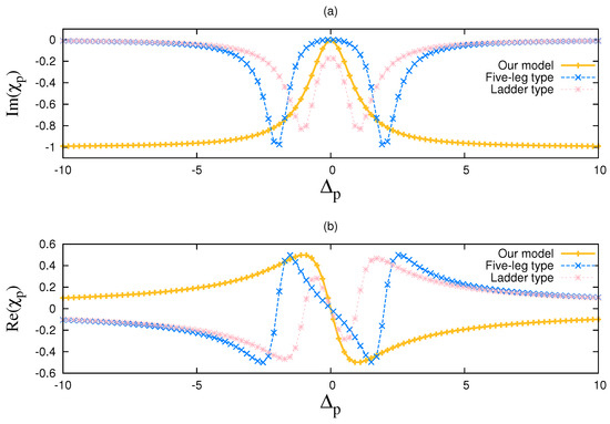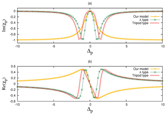which is obtained under the weak probe field limit, and where we have assumed . In this multilevel structure all the () are set to be zero. For the case study, we now look at the structures of and . When , the multilevel system is the type configuration, and when , the system turns into the tripod type configuration. As for the parameter setting, we take the value of as unit and choose , as the typical value setting, together with the assumption , (on-resonance strong field coupling). Then dropping the constant part in both Equation (20) and Equation (21) and adding a minus sign to Equation (20), the imaginary and real part as a function of , in cases of type, tripod type, and result of Equation (20), are plotted in Figure 1a,b.