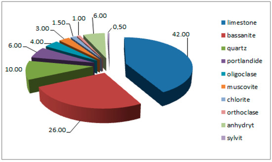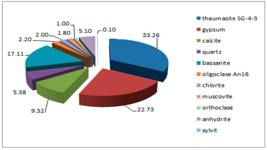 Figure 1 and Figure 2 present the results of a mineralogical analysis of two samples of solids from recycled sludge water from the concret plant labeled Stage 1 and 2. Figure 1 clearly shows that significant mineralogical proportions consist of these minerals: silica (SiO2) 10%, bassanite (CaSO4·0.5H2O) 26%, and limestone (CaCO3) 42%. In the sludge water sample marked Stage 2 (see Figure 2), significant mineralogical composition consists of these minerals: thaumasite (Ca3Si(OH)6(CO3)(SO4)·12H2O) 33%, calcium sulphate (CaSO4·2H2O) 23%, calcite (CaCO3) 9%, bassanite (CaSO4·0.5H2O) 17%, and silica (SiO2) 5%. The presented results of the mineralogical analysis of the solids of two types of waste sludge water samples from the concrete plant showed different mineralogical composition which, as mentioned above, depends on the type of concrete mixture that is currently produced in the concrete plant and subsequently washed out and recycled by rinsing. Due to the different mineralogical composition of the solids contained in the waste sludge water from the CP, it is necessary to determine the optimal possible replacement of pure mixing water with the waste sludge water from the CP experimentally, in order not to affect the physical–mechanical properties of the produced concrete.