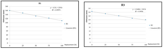 Figure 3 presents the results of a linear regression of diffusion values taking into account the percentage replacement of pure mixing water with waste sludge water from the CP of Formulas R1 and R3. The coefficient of determination R2 is 0.9973 for Formula R1 and 0.9956 for Formula R2. Based on these values of the coefficient of determination (values approaching the value of 1), it can be stated that the equations presented in the graphs (see Figure 3) can be used for extrapolation of diffusion value in the interval of 0–100% replacement of mixing water with waste sludge water from the CP. Figure 3 also clearly shows that the increasing replacement of pure mixing water with waste sludge water from the CP reduces the diffusion value. The reduction is due to an increasing proportion of fine particles that are present in the sludge water from the CP. The increasing content of fine particles is directly dependent on the increasing replacement of pure mixing water with waste sludge water from the CP. This is in line with the results of an experimental research dealing with the use of fine proportions of recycled aggregate in the production of concrete [16]. It has been established that the increasing proportion of fine particles in concrete mixture reduces the consistency of fresh concrete mixture.