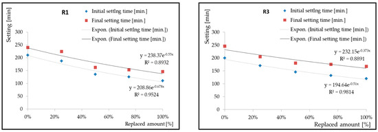 Exponential dependence of the initial and final setting time of Formulas R1 and R3.