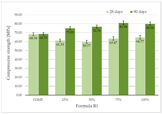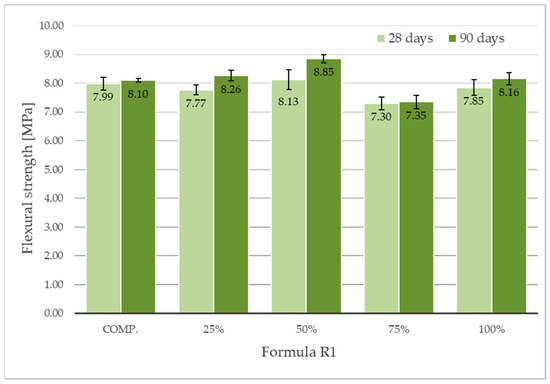 The results of flexural strength test of Formula R1 with CEM I 52.5R, which are presented in Figure 5, show that the flexural strengths after 28 days are within the range of 7.30 to 8.13 MPa, with the highest value of 8.13 MPa being found for 50% replacement and the lowest value of 7.30 MPa for 75% replacement of pure mixing water with waste sludge water from the CP. The flexural strength after 90 days ranged from 7.35 to 8.85 MPa. The highest value of 8.95 MPa was achieved for 50% replacement and the lowest for 75% replacement. It is also apparent that after 90 days, there was an increase in flexural strength compared to the comparative value (i.e., 8.10 MPa) for 25%, 50%, and 100% replacement of pure mixing water with waste sludge water from the CP. This phenomenon is not evident for the flexural strengths determined after 28 days of the test samples.