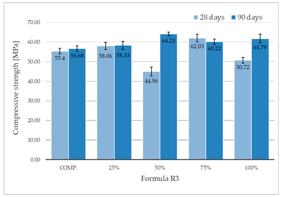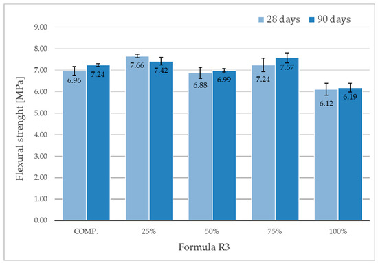 The results of the flexural strength tests after 28 and 90 days of the age of the test specimens prepared according to Formula R3 with CEM II/B-LL 32.5R (see Figure 6) show that the strengths after 28 days were within the range of 6.12–7.66 MPa and after 90 days within the interval of 6.19 to 7.57 MPa. In comparison with the flexural strength test of R1 formula, the strengths values are lower as a result of the use of different kind of cement with lower strength class. The highest flexural strength after 28 days (7.66 MPa) was found in case of 25% replacement and the lowest value (6.12 MPa) in case of 100% replacement. Further, Figure 6 shows the flexural strengths after 90 days showed the highest value (7.57 MPa) in case of 75% replacement and the lowest value (6.19 MPa) in case of 100% replacement.