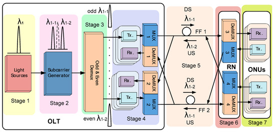 - Lin, S.C.; Lee, S.L.; Liu, C.K. Simple approach for bidirectional performance enhancement on WDM-PONs with direct-modulation lasers and RSOAs. Opt. Express 2008, 16, 3636–3643. [Google Scholar] [CrossRef]