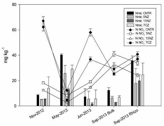 Nmic (columns) and N-NO3− (lines) content of soil samples across the monitoring period.