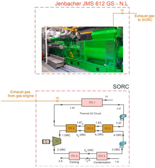 Exhaust gases are recovered from a Jenbacher JMS 612 GS-N engine, which is located in an industrial plant for the transformation of plastic packaging in Barranquilla-Colombia. The engine operates with natural gas as fuel with a flow rate of 120 L/min at a pressure of 116.36 kPa, and a temperature of 38.9 °C by mean of an ORC configuration. The engine operates at 1482 rpm in island mode, with a mechanical power of 1758.77 kW, where the exhaust gases generated by the engine are in a temperature of 435. 1 °C, pressure of 102.30 kPa, and mass flow of 2.77 kg/s. The integration of the SORC system with the gas engine allows one to increase the overall thermal efficiency of the prime mover, as a consequence of the thermal load reduction transferred to the environment, which mean better use of energy [32] as shown in Figure 1.