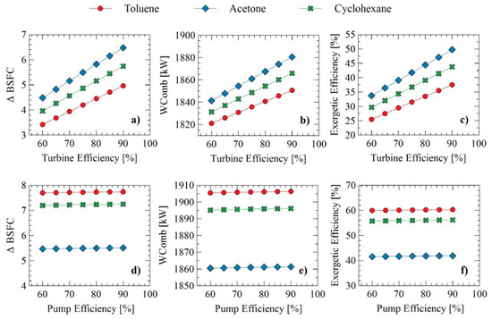 Effect of turbine and pump efficiency variation on (a,d) specific fuel consumption (∆BSFC), (b,e) Wcomb, and (c,f) exergetic efficiency using toluene, acetone, and cyclohexane as working fluids.