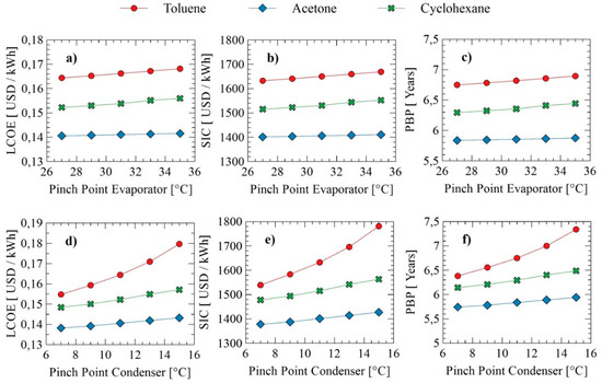 This behavior is similar to that obtained in Figure 4b,e, where the increase of the pinch evaporator generates a decrease of the combined power (Wcomb) of 2.88% (toluene), 0.06% (acetone), and 0.17% (cyclohexane) and a decrease of 1.02% (toluene), 0.30% (acetone), and 0.41% (cyclohexane) when the pinch of the condenser is increased. Finally, the exergetic efficiency also decreases when the condenser and evaporator pinch is increased, as a consequence of the lower energy recovery and increase of irreversibilities in this equipment. In this case, the exergetic efficiency of the system tends to decrease more when the pinch of the condenser with toluene is increased with respect to the other fluids. In this sense, acetone was the working fluid that produced the best results compared to toluene and cyclohexane. It also allows for reaching different performances in the system due to its great sensitivity to operational changes.