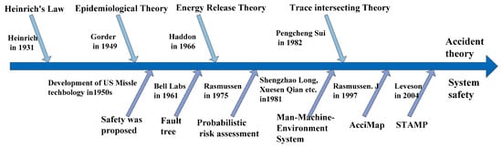 In 1997, Rasmussen initiated the system safety analysis method based on cybernetics and systems theory, in which risk management was described as a control process and risk management must be established based on the classification for hazard sources of control requirements [14]. In 2004, Leveson established a system theoretic accident model and processes (STAMP) based on the system theory. The core idea of the model is that accident is the emergence of interactions between various elements in a complex system, and the lack of control actions that impose constraints on these interactions will lead to accidents [15]. The appearance of the STAMP model leads to the rapid development of modern safety theories based on systems theory. In 2008, Zahra Mohaghegh proposed the SoTeRia method using a combination of system dynamics, Bayesian networks, and other methods to quantitatively describe how influence factors are transferred from organizational factors to technical aspects [16,17]. In 2015, Cody proposed the system-theoretic early concept analysis (STECA) method for safety analysis from the perspective of systems science and control science based on STAMP and hazard analysis technology [18]. Figure 2 shows the development of safety related theory based on the above-mentioned description.
