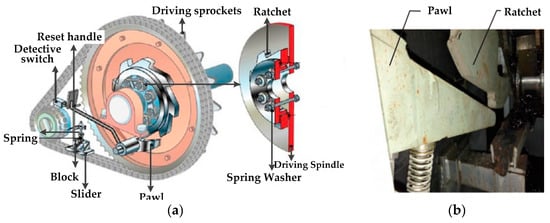 Mechanical structure of escalator emergency brake: (a) Mechanical structure diagram of escalator emergency braking systems (EEBS), (b) Actual ratchet structure.