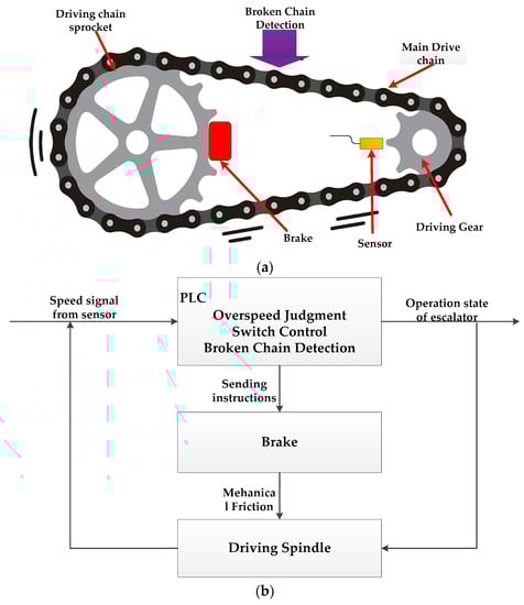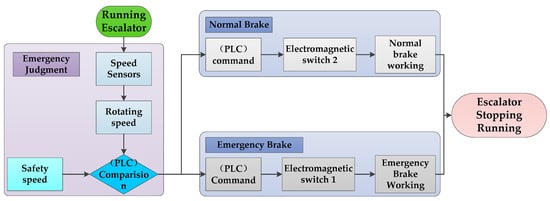 The emergency brake is set under the following conditions according to national standard: (1) The working brake and the elevator system are connected by the transmission chain, (2) The working brake is not the electromechanical brake, (3) The public transport escalator. The escalator or moving walkway should be stopped at a deceleration with obvious feeling and be kept still under the braking force of emergency brake. In general situation, the emergency brake shall act in either of the following two cases: (1) before the speed exceeds 40% of the rated speed, (2) when the travel direction suddenly changes. Figure 8 shows the speed sensors (a) and overspeed protection switch (b). On the basis of above-mentioned description, the working principle of escalator braking system can be shown in Figure 9.