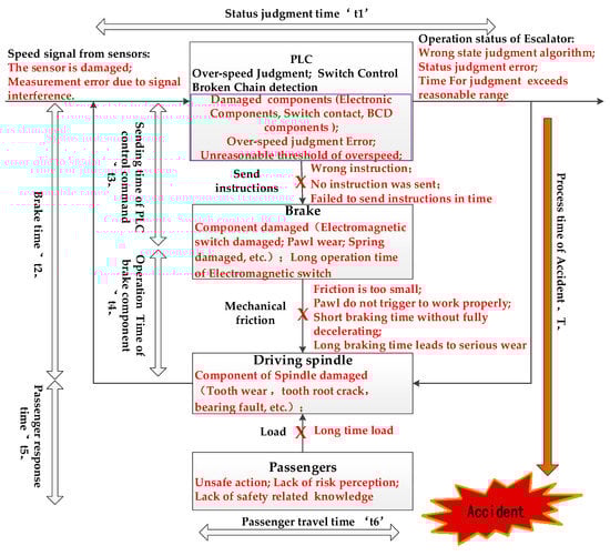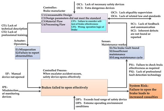 As for the basic system constraint of the effective start of the brake, if it is regarded as a controlled process, then the brake design and manufacturing department can be considered as the controller of the process, and the escalator operator can be considered as the actuator, and the maintenance personnel can be considered as the sensors of the control process. At this macro level, a basic process model is established. With the help of the lack of control in STAMP, the unsafe constraints that may lead to accidents are shown in Figure 11. Besides the unsafe control factors of each part in Level 1, some other unsafe control factors caused by the interaction failure between parts and some related external causes can also be identified.