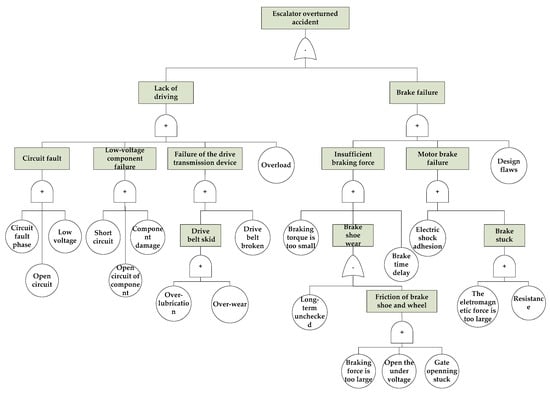 As mentioned earlier, FTA is a typical top-down risk analysis method. It adopts a logical method and carries out hazard analysis work vividly. Its features are intuitive, clear, clear-cut, and logical, and can be used for qualitative analysis and quantitative analysis. In general, the development of safety system engineering is also based on fault tree analysis. In 1974, the US Atomic Energy Commission published a report on the risk assessment of nuclear power plants, the “Rasmussen Report (WASH-1400 report)”, which effectively and extensively applied the FTA, thereby rapidly promoting its development of the FTA [8]. The fault tree is composed of various event symbols and logic gates. The relationship between events is represented by logic gates. Based on the FTA, a fault tree with the escalator reversal as the top event was established as shown in Figure 14.