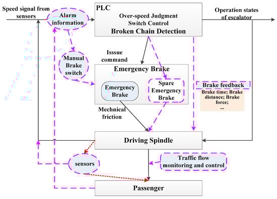 In view of the failure of the brake to start the process effectively, we construct a more specific process model from the perspective of the brake operation principle. Taking the escalator PLC control system as the controller, the brake itself as the actuator, and the drive spindle that needs to be decelerated in the event of an accident as the controlled object, a process model is established. Figure 12a shows the mechanical structure of the drive chain protection device and Figure 12b shows the basic working principle of the escalator emergency brake.