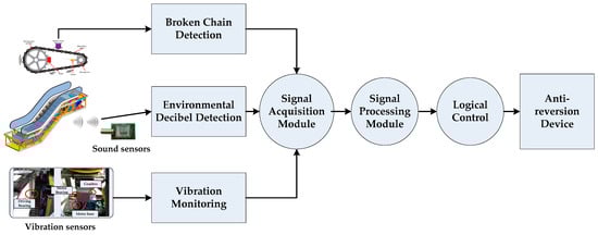 In fact, the above-mentioned improvement measures have a good practical significance for design and manufacture of EEBS. For example, over-reliance on broken chain detection (BCD) of anti-reversion device is an obvious casual factor for reversion accidents. So, a new trigger mechanism needs to be designed to trigger the anti-reversion protection device. Perhaps environmental decibel detection or vibration monitoring of key driving components could be a good choice. When accident happens, many people around the escalator including the passengers will make a scream or call for help, which would significantly increase the decibel value of the environmental voice. When environmental decibel value reaches a certain threshold, the trigger can act timely. Or a vibration sensor for condition monitoring of key driving components can also help to trigger the anti-reversion device when abnormal vibration information appears during accident period. It should be noted that the new trigger mechanism here is only an auxiliary protection device and does not replace the original basic protection principle based on BCD. Here we give a more concrete solution to the above-mentioned BCD, environmental decibel detection and vibration detection to solve the anti-reverse device triggering in Figure 16. We hope to use some comprehensive triggering conditions to reduce the possibility of misjudgment by a single trigger. Therefore, by collecting the signal detected by BCD, the sound signal detected by environmental decibels and the vibration signal of key components, and then using signal processing methods to judge the true state of the escalator reflected by above information, and then logically controlling whether or not to determine to trigger the anti-reverse device. The logic control algorithm here requires a lot of experimentation and data analysis. Here is just a way to solve the above-mentioned improvement measures in a practical way, and specific devices or algorithms require extensive experimentation and validation in the future.
