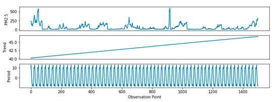 Assume that PM2.5 time-series data Y t has N data, which means t = 1, 2, …, N. The relation with Y t and its three independent components (i.e., trend, period, and residual), as shown in Equation (1).