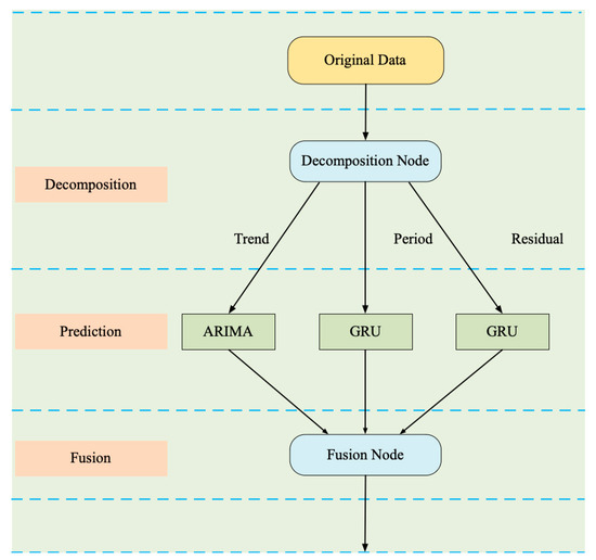 The prediction framework is shown in Figure 2. In the prediction stage, the ARIMA model is used to obtain the prediction of the trend component, and two different GRUs are used to predict the period and residual components, respectively, before finally, all the predictions are added together to obtain the final predicted result in fusion node.