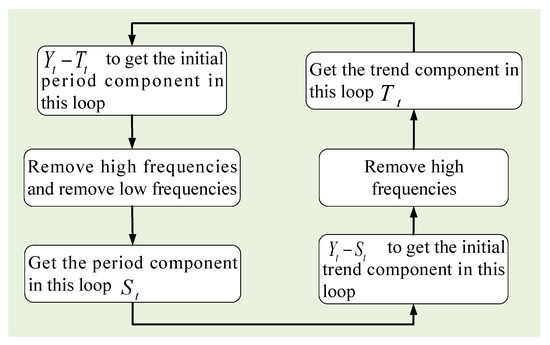 Each component has different frequency bands, that is, the trend and period component are in the low and middle band, respectively. We used the cycle calculation process, shown in Figure 3, to calculate the trend and period components until these two components tended to be stable and no longer changed. In order to start the loop operation, we assumed T t = 0 in the first loop. The time series is fitted iteratively until the trend and period component stabilize, and at the end of the cycle calculation process, the trend component T t and period component S t are extracted from the data series, and the residual component is obtained by