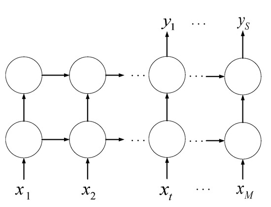 Using the known input and output data, the network is trained by the stochastic gradient descent algorithm, and the optimal weight can be obtained. The GRU network is trained by the decomposed period and residual components. The GRU network consists of multiple GRU cells, and usually has several layers of structure. Shown as Figure 4, x t ( t = 1 , 2 , , M ) is the input of the GRU network, and y S ( S = 1 , 2 , , N ) is the output.