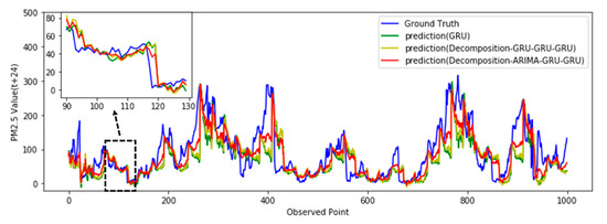 The experimental results show that, first, decomposition is necessary to effectively reduce the difficulty of modeling the PM2.5 data. Second, using different models, especially using the ARIMA model, for the trend component is more accurate than the GRU; and finally the long-term prediction performance was improved simultaneously with fewer parameters and lower calculating cost.