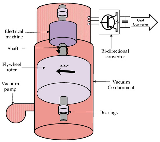 A flywheel storage system works in three modes of acceleration, standby and deceleration. The structure of FESS consists of a bearing system, motor/generator set, flywheel rotor, power electronics and a low-pressure vacuum containment. All these components together determine the overall efficiency of the FESS and are briefly described in this section.
