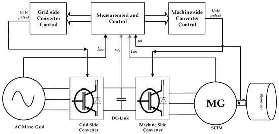 The general schematic of the model discussed in this paper is presented in Figure 3. The flywheel rotor coupled with the SCIM is modelled as an inertia added to the shaft of the SCIM. The dynamics of SCIM-flywheel can be analysed and represented by Equation (28).