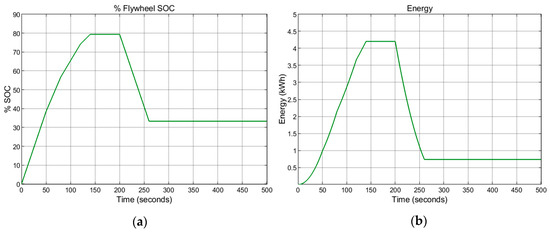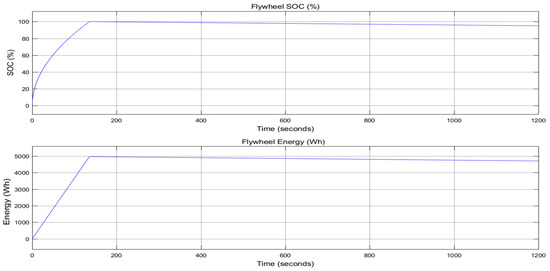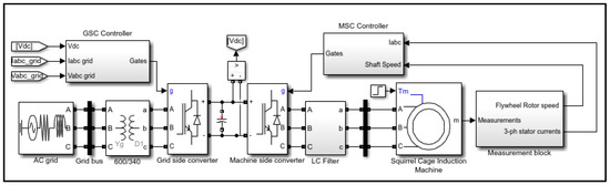 In reference to the dynamic equations and control structure presented in the above sections, the model of SCIM-FESS is developed in MATLAB/Simulink environment as shown in Figure 5. The mathematical relations developed for mechanical and electrical losses as well as the power electronics losses are also embedded in the model to account for the system losses. The SCIM-FESS is set to run for 20 min and dynamic analysis is performed during acceleration and deceleration states within a speed range of 10–20 krpm. During the acceleration state, a positive torque of 90 N·m is applied to charge the flywheel. During the deceleration mode, a negative torque of 90 N·m is applied where the flywheel delivers energy to the electric grid. The SCIM-FESS is designed to deliver 5 kWh of useable energy during which the DC-link voltage is set to 600 V and maintained by the GSC and MSC during different states of operation.