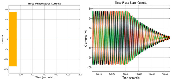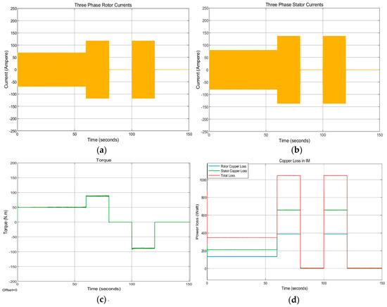 The copper loss in the IM is directly proportional to square of the current and is a function of current and resistance. Copper losses in the stator and rotor of the IM are measured by simulating the copper loss models (Equations (16) and (17)) in MATLAB/Simulink software. The SCIM-FESS dynamic performance was analysed at different torque magnitudes in order to demonstrate copper losses at different values of three phase currents. The system was operated with initial positive torque of 50 N·m for 50 s in charging mode and then the torque was increased to its maximum rated value of 90 N·m for 30 s. When the flywheel was at standby mode (t = 80 s), there were no currents flowing through the rotor and stator windings of the IM as shown in Figure 15a,b. At t = 100 s, the IM operated as a generator and flywheel started discharging for 20 s until switching back to standby mode at t = 120 s.