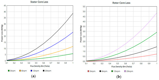 As shown in Figure 14a, the specific core losses increase exponentially with increase in speed and magnetic flux density. The stator specific core losses are not significant for values of magnetic flux density up to 1 Tesla and 3 krpm speed. However, the specific core losses in stator of IM increase significantly above 3 krpms and even at 0.648 Tesla, the power losses due to hysteresis and eddy currents in stator core of IM operating at 20 krpm is 16.48 W/kg. Rotor specific core losses of IM are shown in Figure 14b and it can be seen that rotor specific core losses increases exponentially with increase in maximum magnetic flux density. However, even at a high speed of 20 krpm, the rotor specific core losses are not significant.