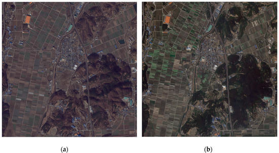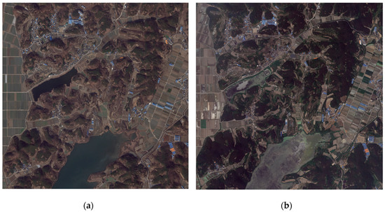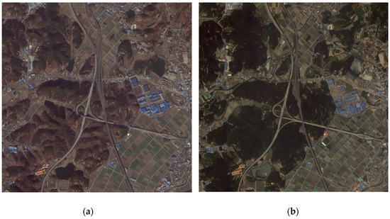 With the development of various high-resolution satellite sensors, it is possible to precisely monitor the surface of the earth [1]. In particular, multi-temporal satellite images are an effective data source that can detect changes in land use and land cover [2,3]; however, it is difficult to maintain radiometric consistency in multi-temporal images due to changes in atmospheric conditions, sensor-target-illumination geometry, sensor calibration, and differences in phenological conditions [4,5]. Therefore, radiometric normalization, which is a preprocessing procedure, is performed to reduce—or eliminate—radiometric differences due to the aforementioned influences and increase sensitivity to landscape changes [6,7].