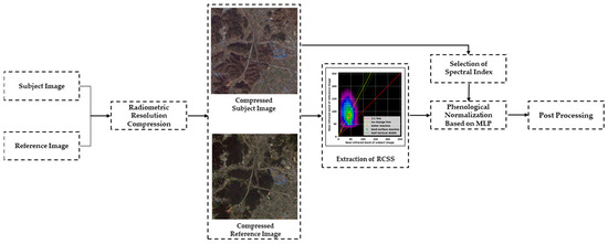 The proposed relative radiometric normalization framework can be decomposed into five steps: (1) radiometric resolution compression, (2) extraction of RCSS, (3) selection of a spectral index, (4) phenological normalization based on MLP, and (5) postprocessing, all of which are shown in Figure 4. The details of each step are described below.