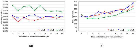 At this point, hyperparameters, such as the number of hidden layers, the number of neurons for hidden layers, learning rates, epochs, activation function, loss function, or optimizer, must be set up in order to construct the applicable MLP model [30]. The hyperparameters in the proposed method are selected based on experiences and experiments. As for the number of hidden layers, an increasing number causes a loss in the generalization power of the network, which might cause overfitting [49]. Furthermore, it increases the overall complexity of the algorithm and the training time [50]. Therefore, after considering the nature of the normalization, with limits of training time, only one hidden layer is considered [21,25]. As for the selection of the number of neurons for the hidden layer, the comparison experiments are conducted by setting the number of neurons to 2, 3, 4, 5, 6, 7, 8, 9, 10, and 15. The performance evaluation is conducted with normalization accuracy, normalized RMSE (NRMSE), which provides a lower value and better performance while taking the visual and quantitative aspects of the normalized image into account; Figure 5 shows the confirmatory results. The results show that, after three neurons, the time cost sharply increases, while the accuracy is not improved with the increase in neurons. Therefore, to balance the accuracy and time cost, three neurons for the hidden layer are selected in this experiment. As for the epochs and the learning rate, the figures 200 and are chosen, respectively, to prevent overfitting [34,51]. Furthermore, the activation function, loss function, and optimizer are selected as the rectified linear unit (ReLU), squared error, and adaptive moment estimation (ADAM), respectively. Table 2 summarizes all of the hyperparameters of the MLP and the values used in the proposed method.