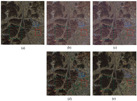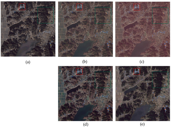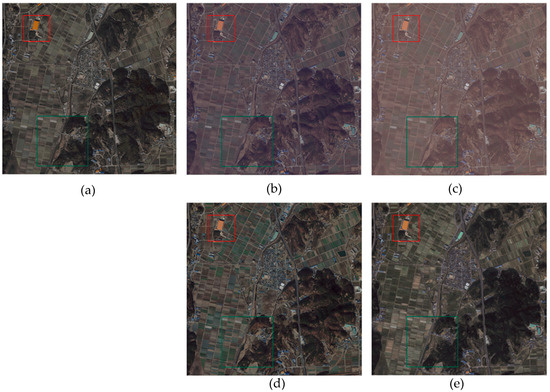 Comparison with the results of relative radiometric normalization for site 2: (a) proposed method (b) MS, (c) NC, (d) histogram matching, (e) RF.