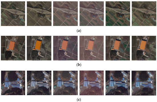 Enlargement of the built-up area marked with a red rectangle: (a) site 1, (b) site 2, (c) site 3. From left to right: reference image, proposed method, MS, NC, histogram matching, and RF.