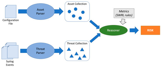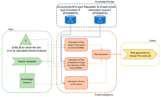 In order to infer the risk calculation considering the previous parameters, the architecture makes use of Semantic Web Rule Language (SWRL). This reasoner tool uses a set of rules based on an action-reaction approach in such a way that if an antecedent is fulfilled, a specific consequent will be triggered. In the case of the proposed architecture, if a detected threat affects a type of device (antecedent), the consequent is executed, i.e., the impact on the assets of the affected device is calculated. In addition, the system is designed to receive threat events from various sources. Thus, a module has also been designed to characterize the trust in information sources. That means, given a source of information, its threat events will be considered with more or less relevance depending on its trust level. Figure 3 depicts the whole system described above.
