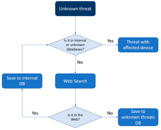 In addition, the system should perform an enrichment of knowledge about the threat received by using external sources of TI, which enhances its correlation with asset analysis. Making use of INCIBE’s AntiBotnet service, offered through the website of the Office of Internet Security (OIS), the system is able to collect information about types of devices affected by any threat. This search is carried out supported by a web scraper searching, which is ready to use keywords such as “Windows”, “IoT“, “Router“, etc. In case any information is unfound, an assignment of affected devices is made based on probabilities defined within the system’s configuration file. In both cases, the information is stored in separated databases, one for the threat found, and the other which registers threats for which the TI service used has no information. Figure 4 shows the flowchart that describes this functionality.