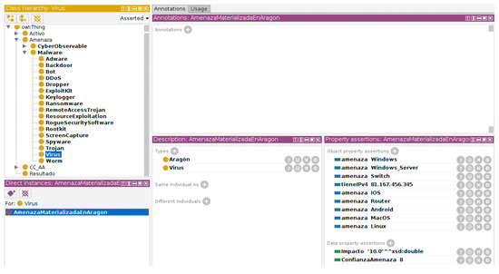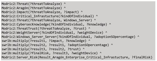 Once both assets and threats are modeled in OWL format, the SWRL rules can be executed. These cover the whole combination between the different administrative domains, asset types, device types, and devices’ operating systems, if applicable. The implemented system has a total of 2508 rules. Figure 6 shows an example of a rule used to analyze the risk of threat. In concrete, this risk was materialized on the servers of a critical company supported by a Windows Server, within the administrative domain of the autonomous community of Aragon. The analysis process described is detailed in Figure 7.
