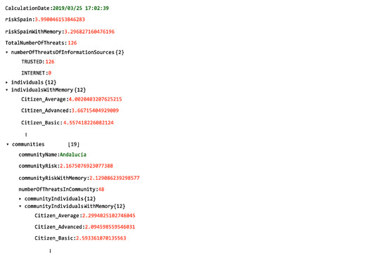 Here, 126 threats were analyzed, which came from sources of information with a high level of confidence, and therefore, all of them were influenced by the confidence assigned to that source. As can be seen, there is a considerable difference between the general risk for Spain (riskSpain) and the risk when taking into account the history of attacks, that is, the memory of the system related to how old the attacks are by applying equation 5 (riskSpainWithMemory). If this situation were maintained over time, the risk with memory would end up converging with the instantaneous risk. In addition, the risk within an AC, i.e., Andalusia, is calculated based on 48 threats, both with and without memory.