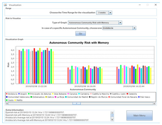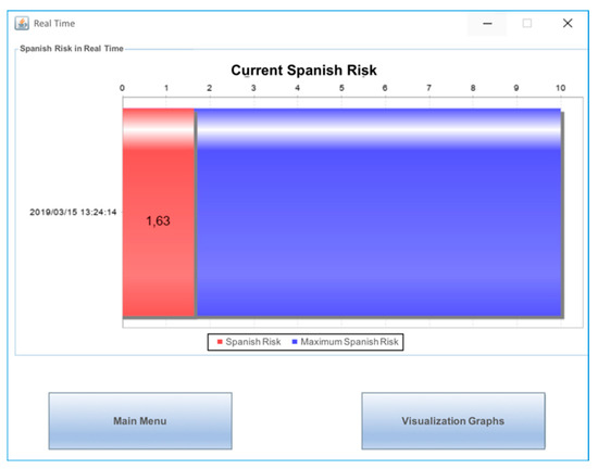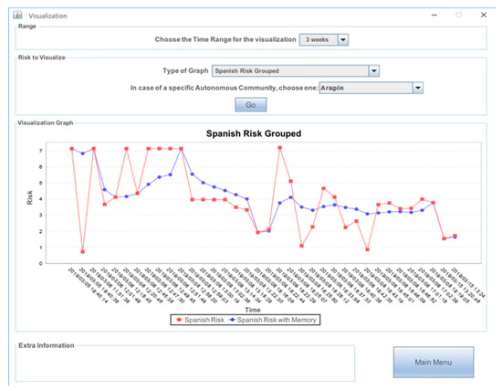 In order to simplify the visualization of the data produced by the system, a graphical interface was implemented by using Java’s library JFreeChart. Figure 10 shows the history of the general risk in Spain, both with memory and the instantaneous one.