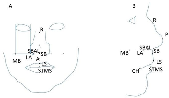 Points for measurement by Resnick et al. (A) Frontal view. The two points derived for this study are shown: lateral ala point (LA), defined as the intersection of lines tangent to endocanthion (EN) and subnasale (SBAL), and maxillary buttress (MB) point, and defined as the intersection of lines tangent to exocanthion (EX) and SBAL. (B) Lateral view showing all points [].