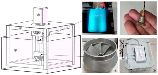 Due to limitations of the test environment, a 0.1 scale RCP impeller (maximum diameter of 92 mm and height of 53 mm) was taken as the research object. In order to measure natural frequencies of the impeller in water, it is necessary to transmit rotating vibration signals to collectors. This study installed the motor upside down, and immersed the shafting in the tank. The test schematic diagram is shown in Figure 1. Upper and lower bearings with end caps are used to ensure stable rotation of the spindle. The motor is inverted above the frame. A rigid coupling connects the upper end of the spindle to the motor output shaft. The signal testing equipment mainly includes waterproof, magnetic, piezoelectric accelerometers [12], charge amplifiers, NI (National Instruments) Data Acquisition Card, slip rings and a computer for monitoring data. This test platform is being applied for a Chinese patent. In addition to measuring natural frequencies, it can be used to test the blade vibration when the interaction occurs between rotor and stator.
