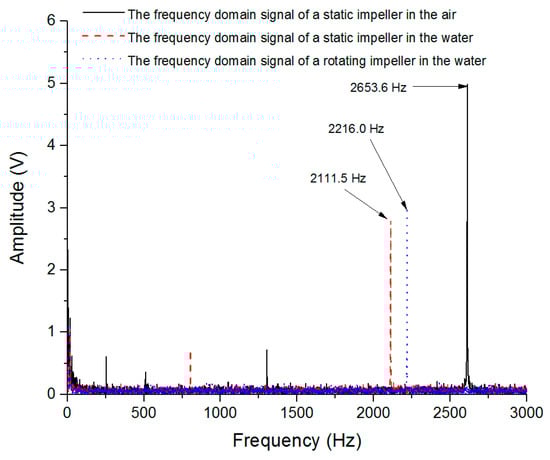 On this bench test, natural frequencies of the static impeller in the air (Condition A), the static impeller in water (Condition B) and the rotating impeller in water (Condition C) were measured. By Fast Fourier Transform Algorithm (FFT) analysis [16] and filter process (filtering shaft frequency and its multipliers), spectrograms of measured signals under these three conditions are shown in Figure 2. Natural frequencies of the impeller are 2653.6 Hz, 2111.5 Hz and 2216.0 Hz, respectively.