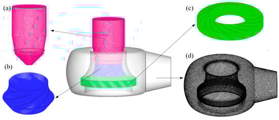 Mesh diagram of the model ((a) Inlet pipe (b) Impeller (c) Vane diffuser (d) Volute).