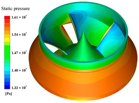 When the computation stopped, the steady-state static pressure on the impeller boundaries was recorded, which is shown in Figure 4. The static pressure on the outside of the hub is greater than that on the inside. Due to the seal of the wear ring, the static pressure on the outside is close to the outlet static pressure of the impeller. Figure 5 shows the static pressure on both sides of the blade. It indicates that the pressure difference between the two surfaces gradually decreases along the flow direction, which means that inlet edges of blades bear more load than outlet edges.