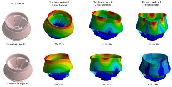 Comparison of natural vibration modes before and after impeller improvement.