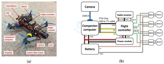 Figure 2b shows the wiring diagram of our UAV. The high-speed camera transmitted a raw image to the companion computer via a USB3.0 cable. After the relative pose was calculated, the current position and setpoint were transmitted to the flight controller using the mavlink protocol via an FTDI USB to TTL cable. Finally, PPM signals were sent to ESCs for converting them to 3-phase signals to drive the brushless motors. The specifications of our platform are shown in Table 1.