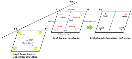 At time t, we can classify features into some sections by using the center of all image features, C, as shown in Figure 4. Then the four features are computed as the centroid of all selected features by employing the image moment [44] in the following equation with known features in each section: